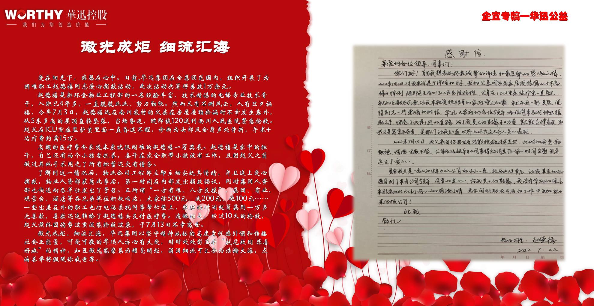 華迅自1998年成立以來,一直堅(jiān)持慈善公益,從未間斷。不忘初心,時刻踐行“永續(xù)經(jīng)營,回報社會”的經(jīng)營理念,累計(jì)捐款逾1000萬元。其中,在民建“善德基金”認(rèn)捐100萬;定向捐助萬州特殊教育中心10萬;在重慶市慈善總會設(shè)立“華迅-AI”基金,認(rèn)捐500萬;在“綠化長江 重慶行動”大型公益活動中,為母親河植樹造林捐款100萬;設(shè)立“華迅捐資助學(xué)基金”200萬等,為慈善建設(shè)持續(xù)貢獻(xiàn)力量。