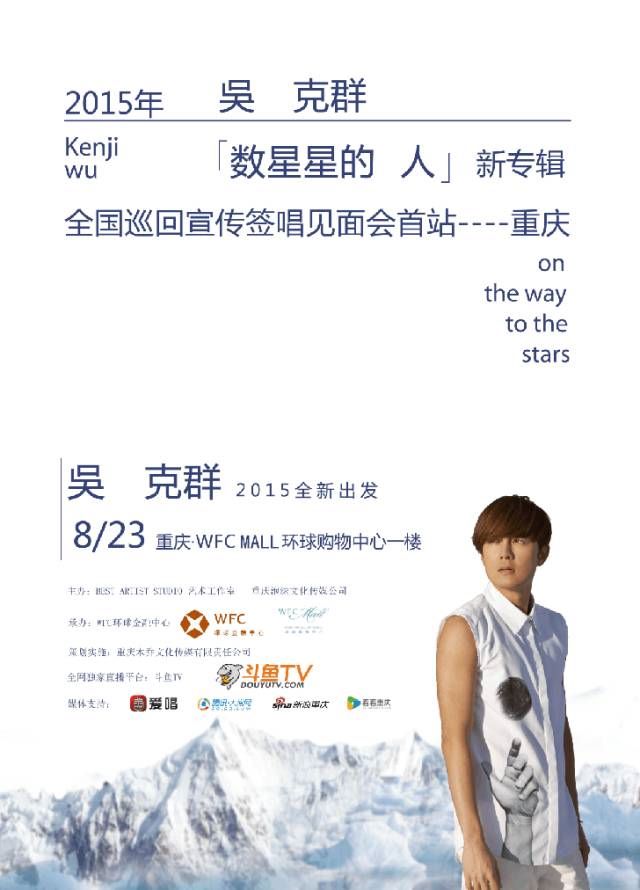 8月23日 下午15:00搖滾詩(shī)人吳克羣將攜2015年全新專輯《數(shù)星星的人》來(lái)到WFC MALL環(huán)球購(gòu)物中心舉行全國(guó)巡回宣傳簽唱會(huì),WFC MALL環(huán)球購(gòu)物中心作為西南地標(biāo),此次更是作為宣傳簽唱會(huì)首站,內(nèi)場(chǎng)名額和“好白菜”同樣可貴,走心的你肯定是內(nèi)場(chǎng)名額&“好白菜”兩手都要抓的,加油咯~
