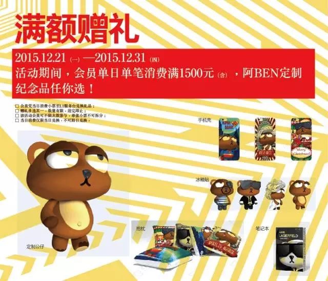 單筆消費(fèi)滿(mǎn)1500元,毛絨公仔、手機(jī)殼、抱枕、筆記本、冰箱貼,阿BEN定制紀(jì)念品任你選!