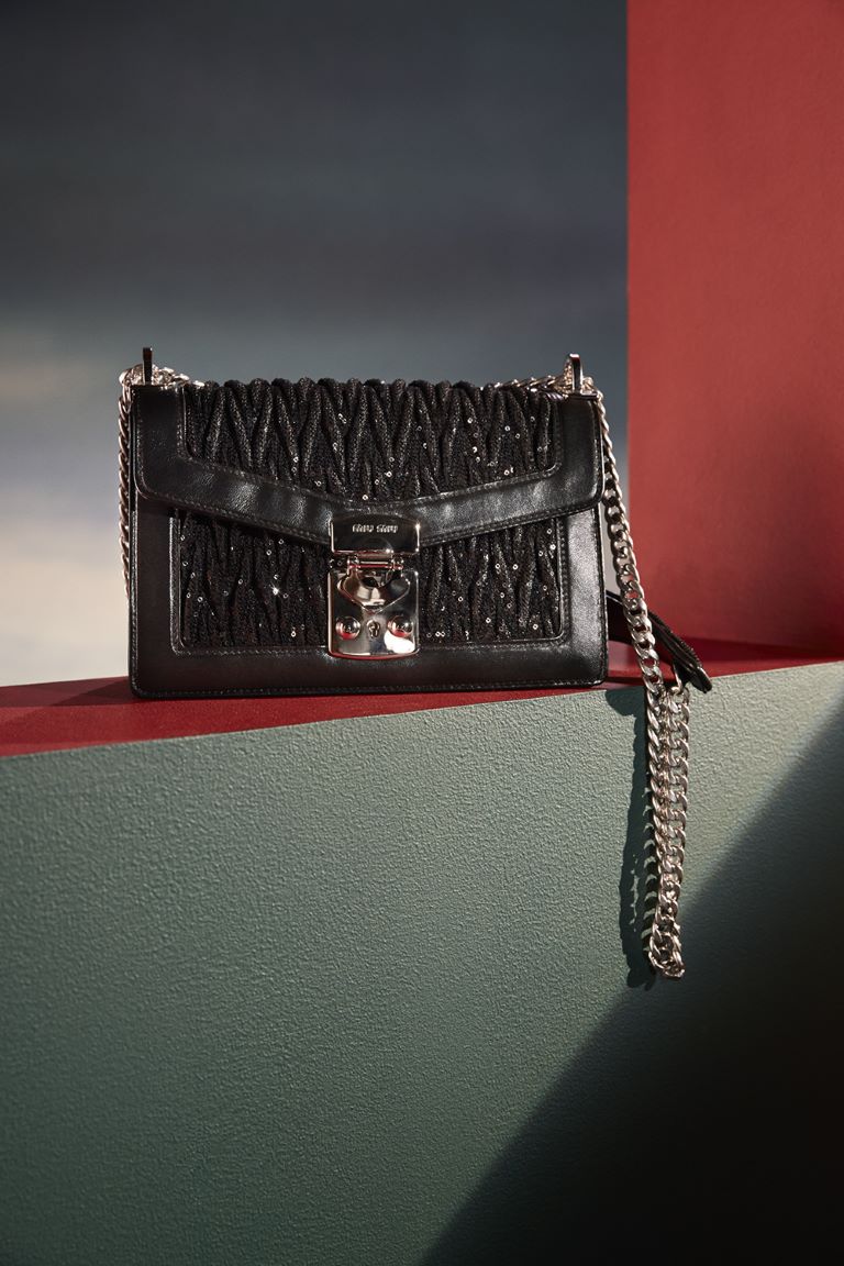 Confidential、Miu Lady和Camera Case手袋,以及腰包和水桶包甄選山羊皮、小馬毛或小牛皮精心打造,鑲嵌紅色、銀色、藍色、黑色亮片與水晶元素,平添奇幻俏皮風情。