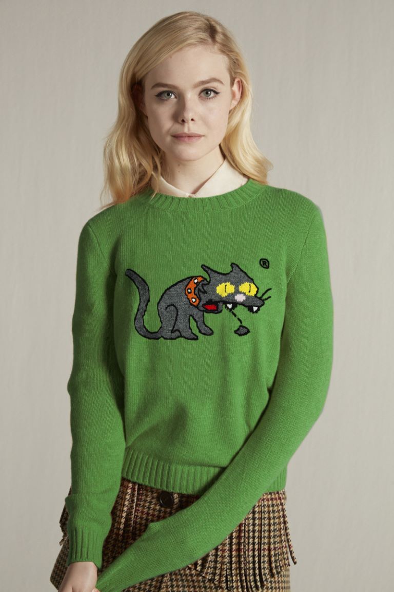 Miu Miu寵愛俏皮貓咪的傳統(tǒng)由來已久,從成衣、配飾到鑲嵌珍珠水晶的珠寶,貓咪的身影無處不在。假日季全新呈現(xiàn)“貓咪”主題的設得蘭羊毛衫,定格動畫片中最具知名度的貓科動物角色。迪士尼動畫《貓兒歷險記》(The AristoCats, 1970)中活潑可愛的Marie以主角之姿撩撥少女心;《辛普森一家》(The Simpsons’, 1990)中戲謔替代家貓Snowball的Snowball II成為本系列的點睛之筆。
