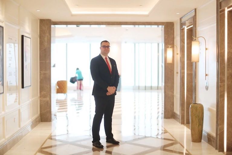 Timmy把一撥撥剛抵達酒店的客人送到幾步之外的前臺,那邊,前臺副經(jīng)理Cindy和她的同事們就接著幫客人辦理入住手續(xù)。