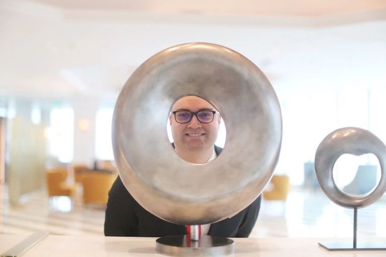 從地面一樓乘電梯升抵69樓,一出門,你就會看到Timmy微笑的面孔。作為酒店的服務大使,Timmy每天都會在69樓空中大堂電梯口,微笑著迎來送往酒店的客人。