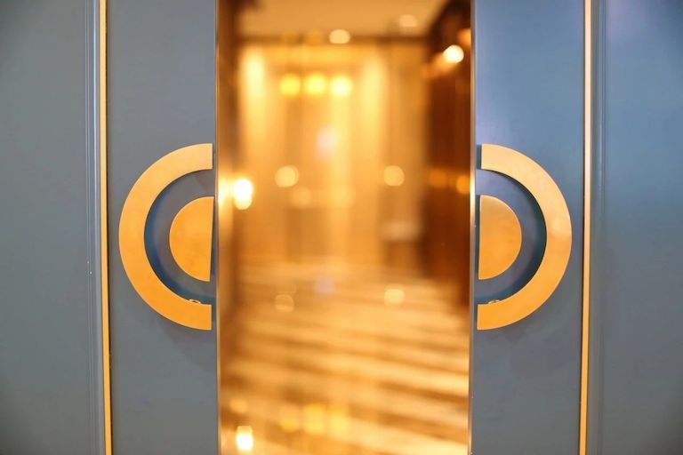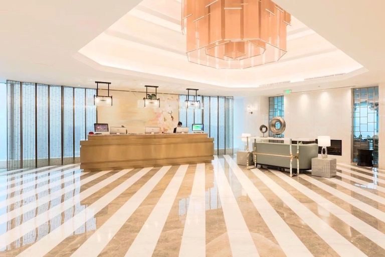 重慶麗思瑞酒店的大部分公共區(qū)域,像大堂、大堂吧和西餐廳都在69樓,客房則要順勢而下,乘坐另一部空中電梯下到68-58層。
