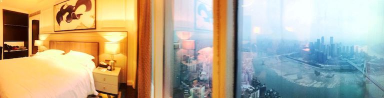 住酒店,我喜歡住角落房,因為可以270度看風景。住6001,可以從東面的南山日出一直往西跨越長江、江北區(qū)、嘉陵江到西面的渝中區(qū)日落。