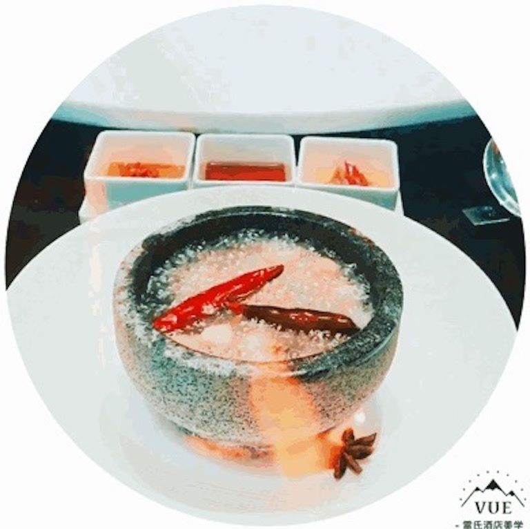 蒜頭和橄欖油一起放在石鍋里油炸,用石鍋的溫度把橄欖油加溫,來燙熟龍蝦,有很濃的蒜香味。菜看上去是簡單,但口感潤滑,原汁原味。加辣椒又可以增加它的香味。