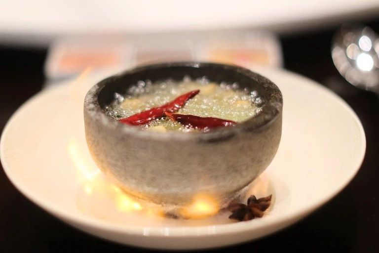 Lens一般都會在客人面前現(xiàn)場做這道菜,他把做好的楊枝甘露放在鋼吸瓶里,經(jīng)過液氮一兩百度低溫處理之后,就很脆,其實里面還有汁水,然后配上腌制好的紅酒、梨、雪蛤、壓縮過的燕窩、一些紅糖碎片,再用噴火槍去噴,這樣外層是開始融化的那種熱,里面還是有液氮的冰,口感很豐富。