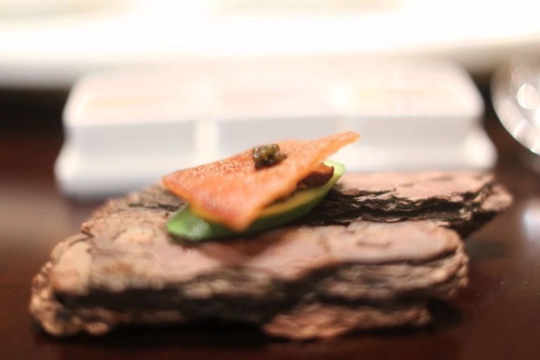脆皮乳豬上放了點魚子醬,下面是黃瓜,中間還有一小塊肉。先吃皮,然后一口將四者共同咬進嘴中,脆皮乳豬的香脆,接著是魚子醬的鮮美,肉的香,最后是黃瓜的清爽,口感豐富,縈繞舌尖。