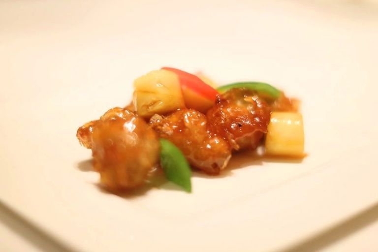 脆皮遼參,是譚師傅在重慶做的創(chuàng)新菜之一,做法很有趣,里面有酸木瓜,包在里面有點酸辣;外邊皮是脆皮漿,淀粉包漿??诟惺峭獯嗬锩嫠崂?,開胃。