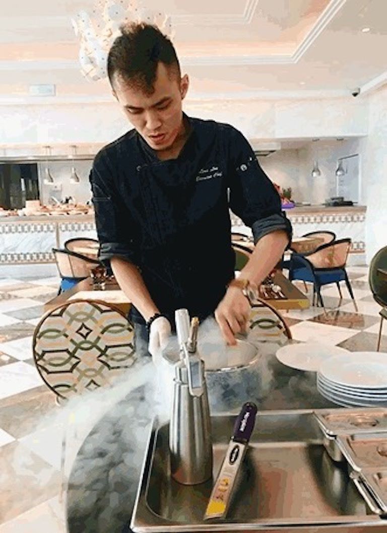 菜如其人,潮人Lens做“潮菜”,他最擅長的是運用目前世界流行的分子料理設備融合技術(shù),來烹飪出無國界料理。