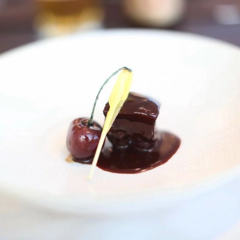 車厘子低溫燜紅燒肉,也是Lens低溫慢煮的一個杰作。先55度煮豬肉30小時,然后再高溫驅(qū)烤,最后配紅燒肉汁醬;車厘子也是用醬汁處理過的。二者不論顏色口感都很配搭。