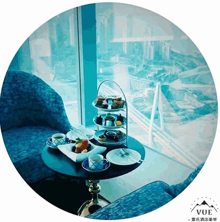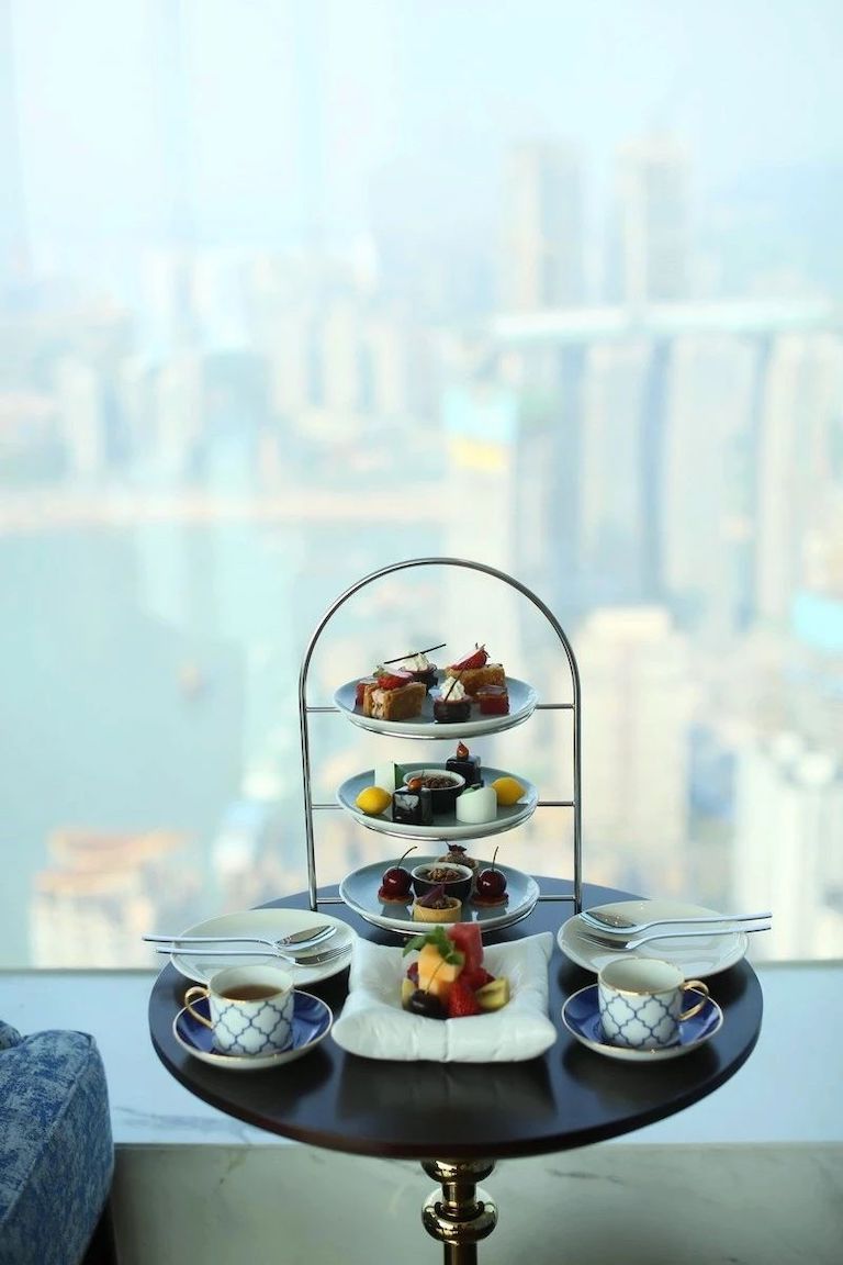 在重慶麗思瑞酒店69樓空中大堂喝下午茶,看著窗外腳下千廝門大橋上車流穿梭,長江嘉陵江游船上上下下。