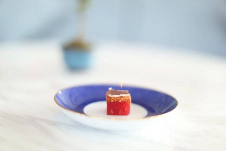 前者驚喜在不像西紅柿的西紅柿。Lens用冷壓縮的腌制法去處理,這樣口感更柔,用來搭配火腿,中間還加了一些特別調(diào)制的粉,是用面包糠配花生碎、紅糖、香料進去攪拌出來的。 西瓜有甜,火腿有咸,粉有香料有花生,口感十分特別。